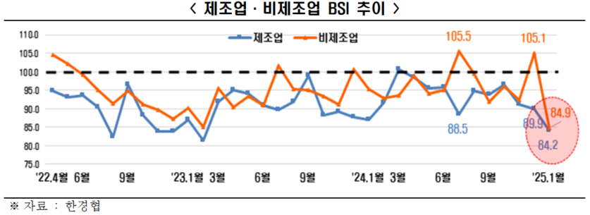 25년 BSI 지수를 봤을 때 하락폭이 크다. 오르락 내리락 하며 그래프의 수치가 90 이상을 유지해 왔는데 25년 1월의 전망은 부정적으로 바라보는 시선이 많은 것 같다.
