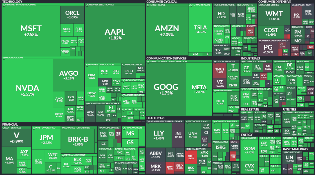M7 기업들은 미국 증시에서 S&P 500 지수의 큰 비중을 차지하며, 이들의 주가 변동이 전체 시장에 큰 영향을 미친다. 2024년 7월 초 기준으로 M7 기업들의 비중은 S&P 500 전체의 약 30% 이상을 차지했다. 더불어 미국의 시가총액은 전세계의 50% 이상을 차지한다. 이 말인 즉슨 미국의 M7 기업의 주가가 글로벌 경제에도 영향을 미칠 수 있다는 이야기다. 실제로 M7 기업들의 실적발표가 나스닥 지수의 향방을 결정한다고 해도 과언이 아니다. 위에서 보여지는 히트맵이라고 불리는 현황판을 보면 알파벳 몇 글자로 기업의 이름을 유추해볼 수 있는데, MSFT 마이크로소프트, AAPL 애플, NVDA 엔비디아 등등. 크기만으로도 이 기업의 비중을 확인해 볼 수 있다. 조금 크다 싶은 사각형에 M7 기업이 다 적혀있다.